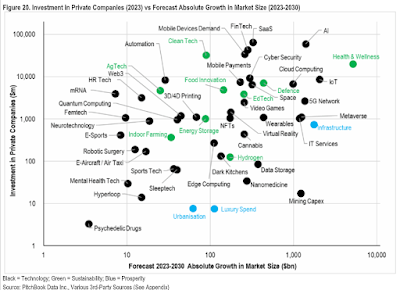 It shows the metaverse with a current market size of $90bn, but with a forecast growth to 2030 of over $1tn (which puts it about 6th, alongside AI). Note that there is also a separate entry for Virtual Reality. The report also suggests that investment in the metaverse is on the low side (given the log scale).